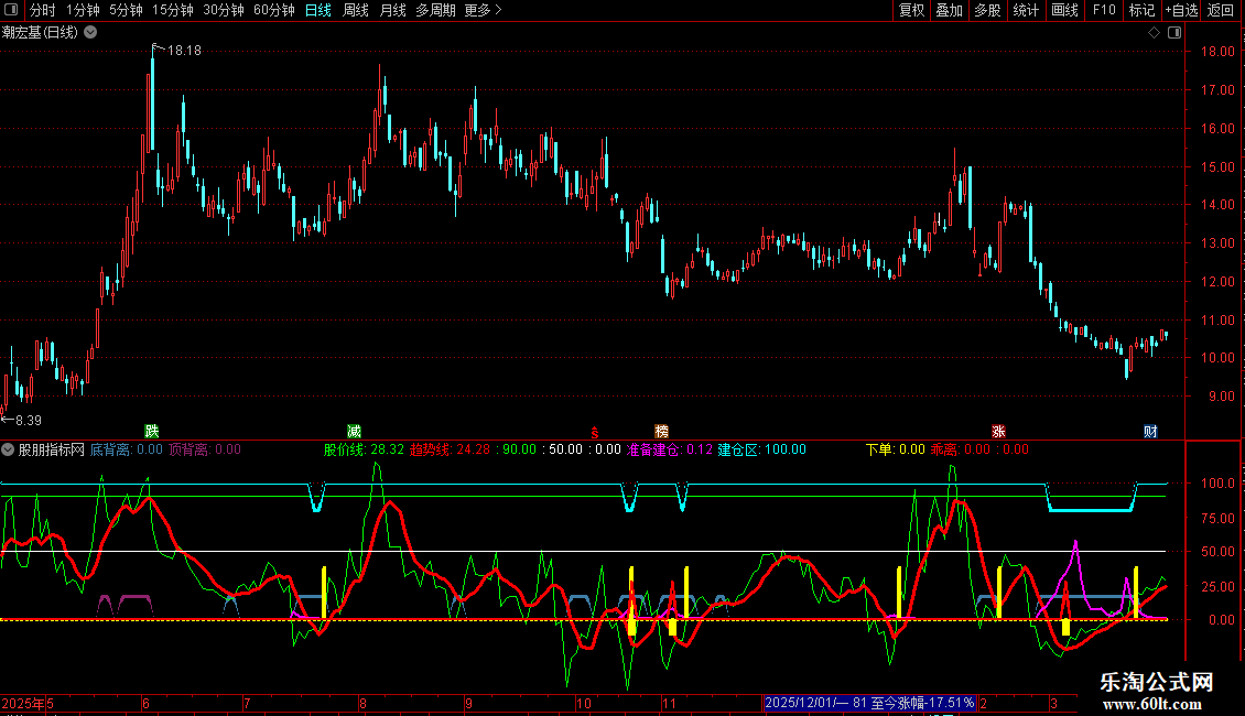 底背离:IF(MN< -4 ,17,0),COLORA67D3D,LINETHICK3;