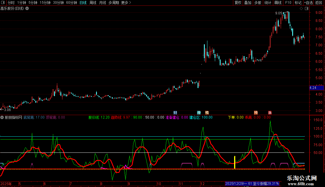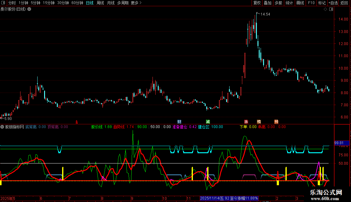 顶背离: IF((VAR26>90),17,0), COLOR6B238E,LINETHICK3;