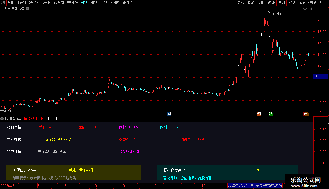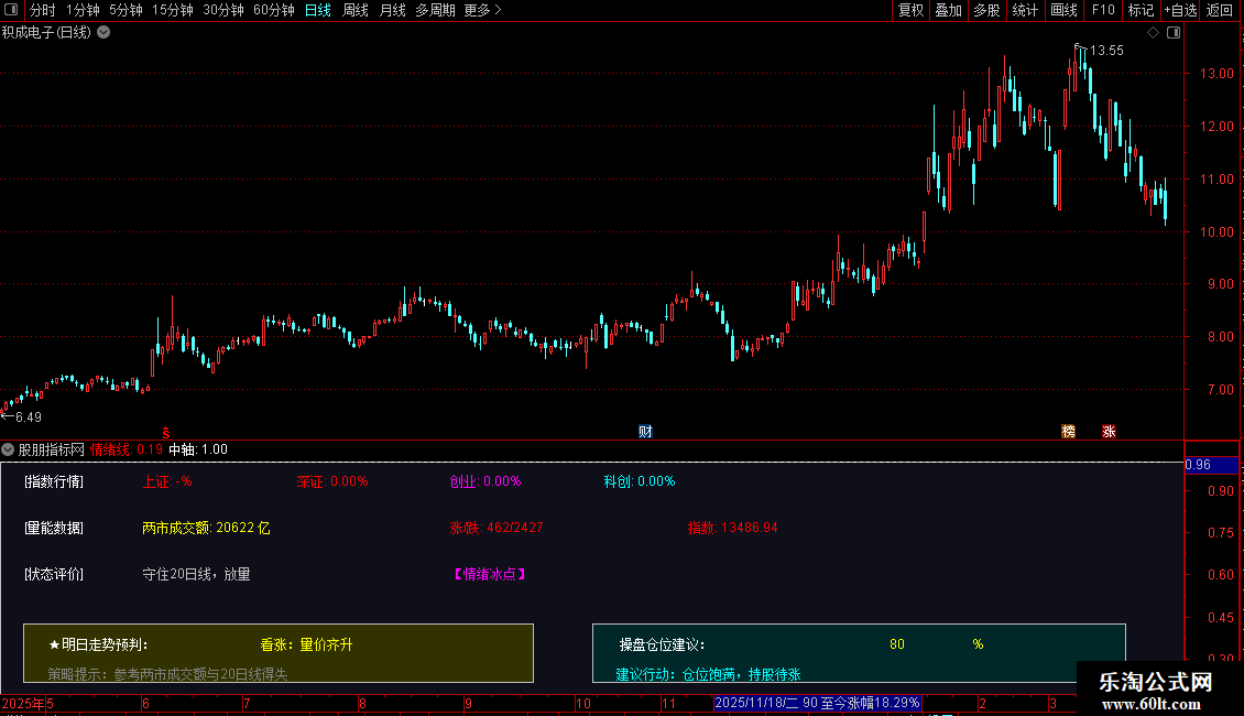 情绪评分:=IF(涨跌比>1.5 AND INDEXC>EXP_MA20, '【情绪亢奋】',