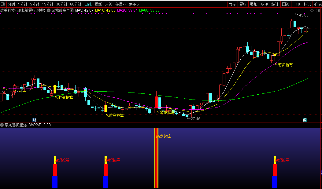 3、当公式出现“游资抢筹”信号,则是游资准备介入的信号,可予以关注。