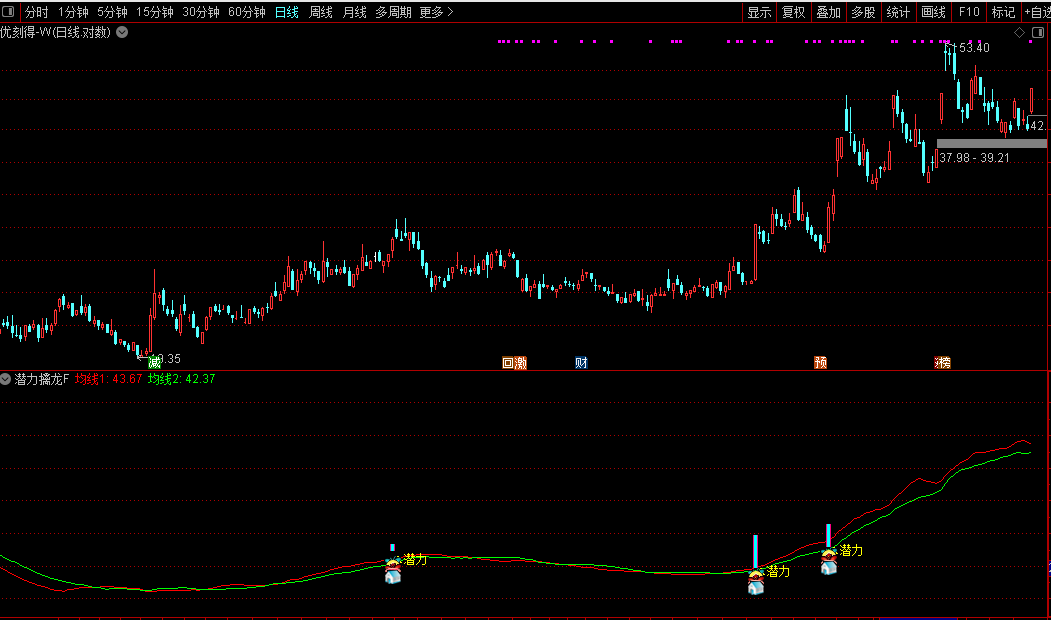 当副图界面出现彩色柱状信号,并伴随多个图标标记及“潜力”文字提示时,表示该个股满足综合选股条件。具体运用要点如下: