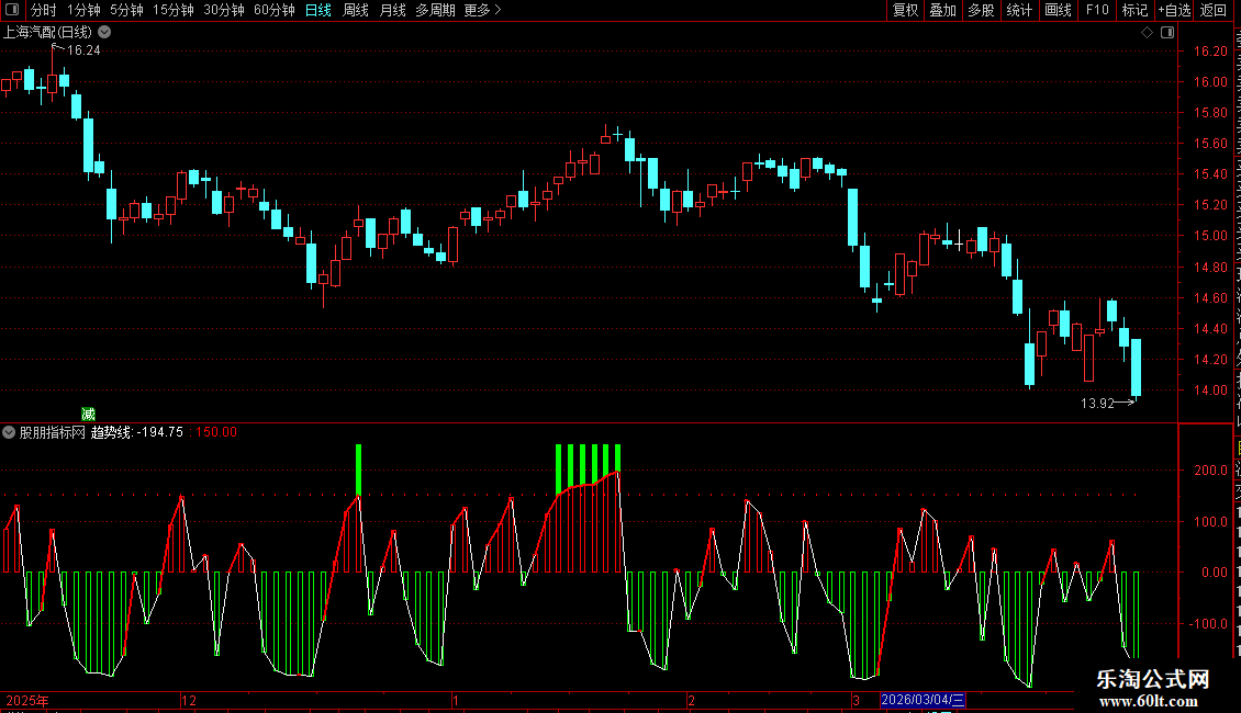 当“趋势线”数值超过150时,会触发一个绿色警示信号,提示可能进入超买或高风险区域。