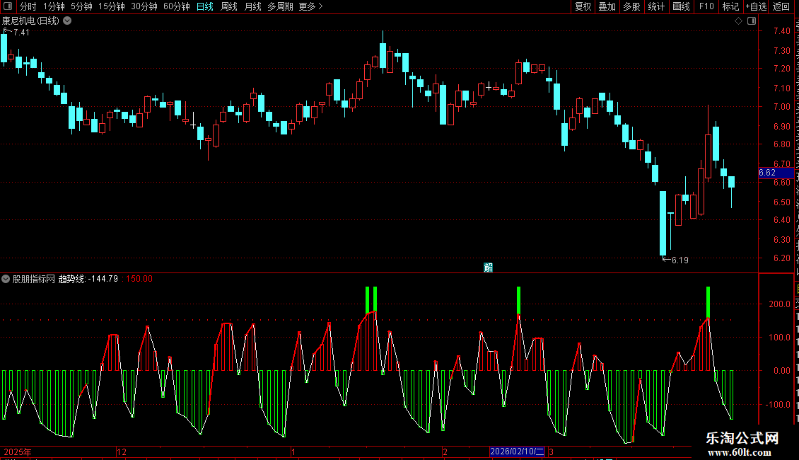 风险警示信号:当“趋势线”数值大幅攀升并超过150参考线,特别是触发顶部绿色警示区域时,需警惕股价可能过热,存在回调风险。
