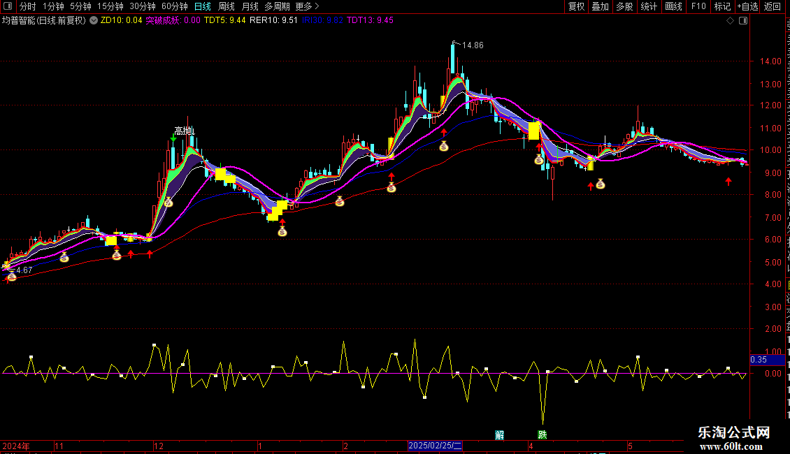 6. 止盈信号:K线上方出现白色“高抛↓”,代表指标进入超买区间,需及时止盈离场。