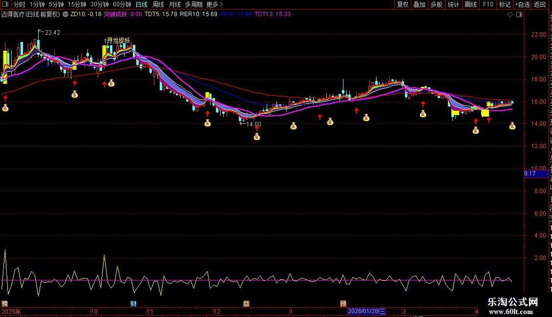 2. 波段低吸:出现红色渐变柱+红三角图标,代表均线金叉叠加低位估值,可逢低布局;
