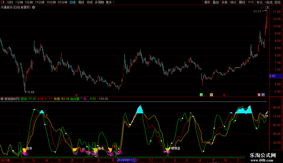 底:DRAWTEXT(CROSS(中线2,-90) AND (长线<中线 AND 长线>REF(长线,1)OR 短线<20 AND 中线<20 AND 长线<20),长线,'底'),COLORFF00FF;