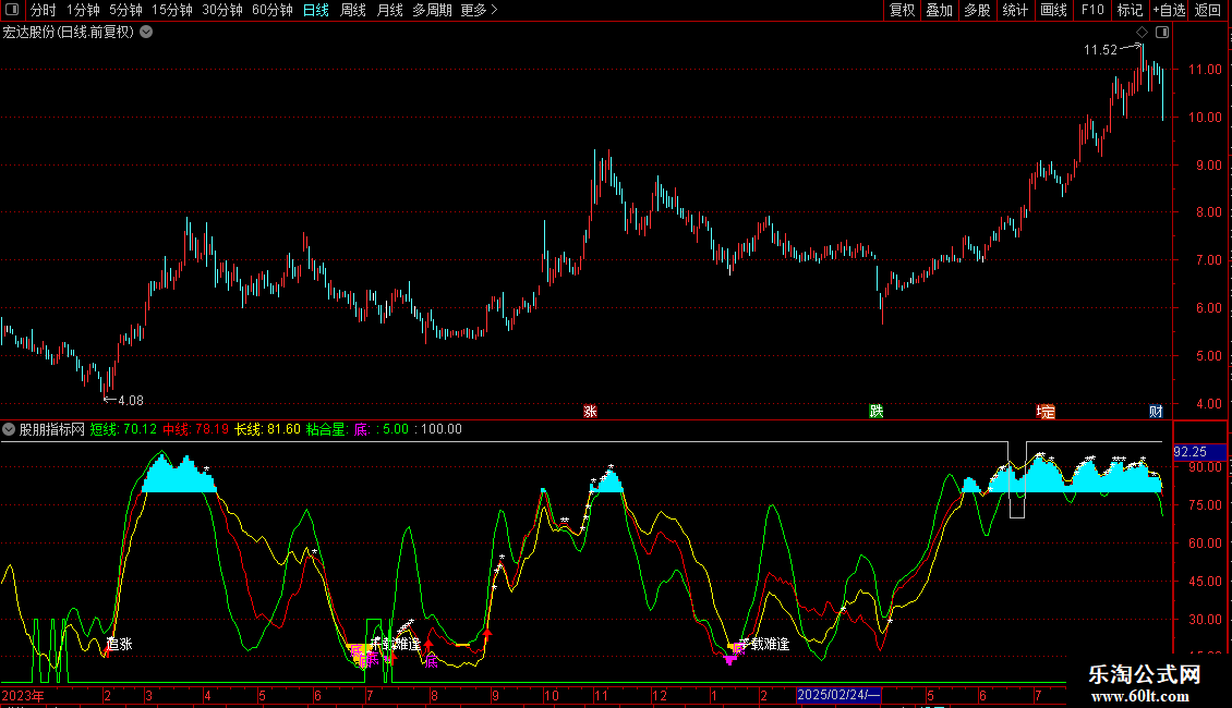 指标通过多周期RSV计算短、中、长三条趋势线,结合标准差通道识别超买超卖。