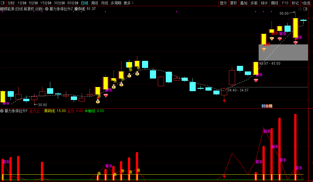 1、当"主力"值超过黑马线(15)且"主力上"大于0时,若主力值在30至70之间,则标记为“暴涨”红钻石信号;若主力值在15至30之间,则标记为“涨”钱袋子信号;若主力值大于80,则标记为“翻涨”黄钻石信号。