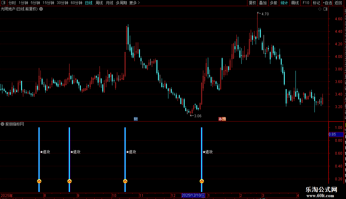 1. 副图指标:安装后副图出现粉色柱状+进攻图标+文字信号,即为标准买入提示,代表个股完成洗盘、放量突破20日压力位,趋势反转。