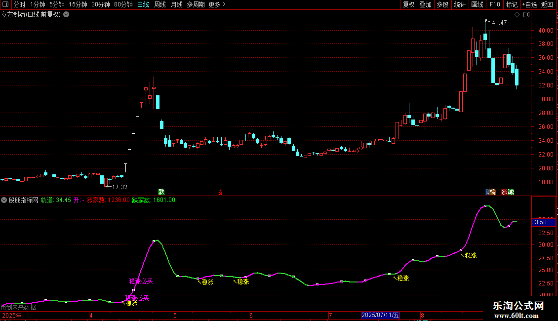指标包含三条轨道线(红轨道、轨道、升),用于判断趋势方向。起爆信号基于MACD差值变化,当差值加速上穿15时提示“稳涨”。稳涨必买信号结合30日RSI快速上升(>9)和放量条件(>2.4倍或连续缩量后放量)。副图还显示涨跌家数及涨停标记。选股预警可直接用于条件选股或盘中预警。