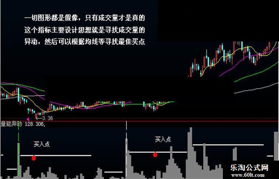 公式分三部分:成交量(用的是日成交量与流通盘的比值)、成交异动位置(竖线)、参考买入点(红色图标及文字提示);