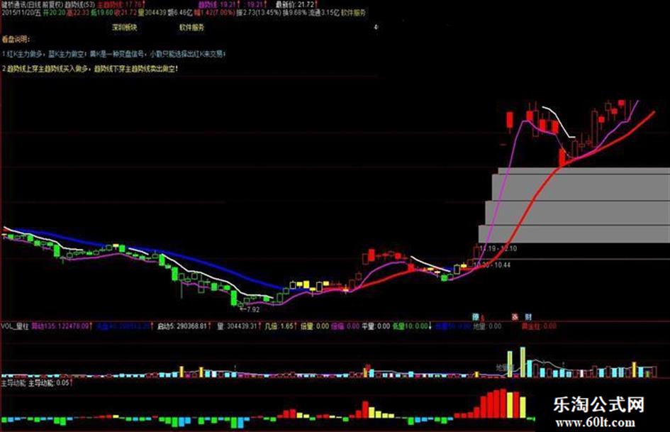 本指标无未来函数!使用说明: 1.红K主力做多,蓝K主力做空;黄K是一种变盘信号,小散只能选择出红K来交易; 2.趋势线上穿主趋势线买入做多,趋势线下穿主趋势线卖出做空! 3.其他意义,请各位自己漫漫体会。