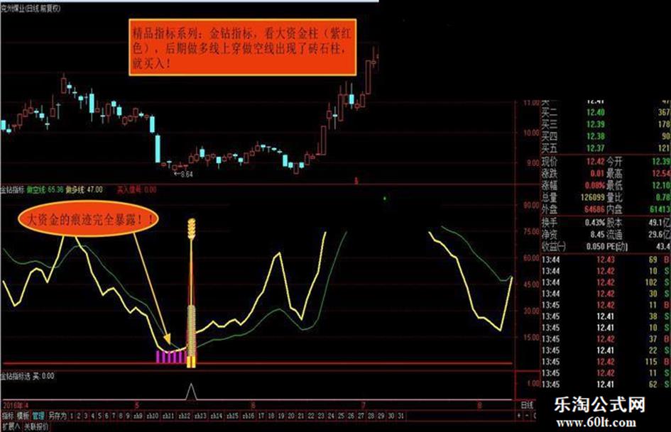 金钻指标!买入前关注是否有大资金量柱(紫红色),留下的痕迹,理解为有资金进场,剩下的时间就看什么时候出现金钻指标柱体了!指标加密了