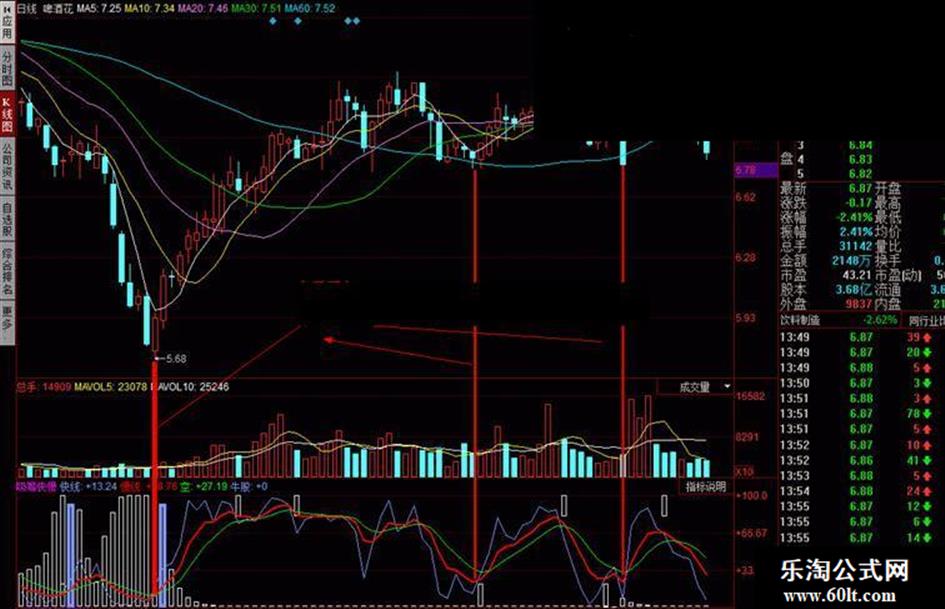 指标中有蓝色柱子,出现该柱子后,后市上涨概率较大。快线对慢线形成金叉买入,快线对慢线形成死