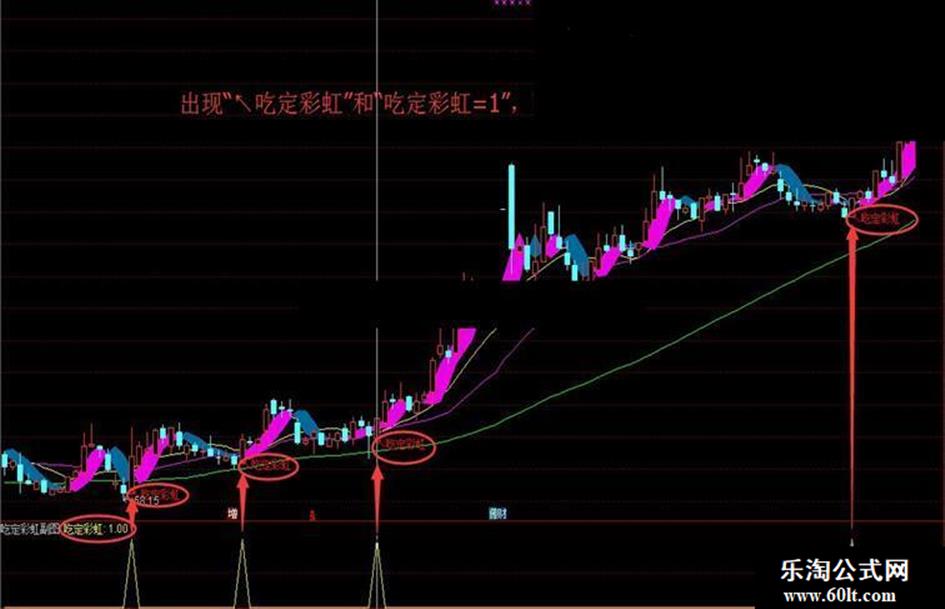 吃定彩虹指标有两种颜色的彩虹,一种是红色,一种是蓝色。红色的彩虹出现在上升趋势中,蓝色的彩虹出现在下降趋势中。一根K线吃掉红色的彩虹,就会出“吃定彩虹”信号。吃定彩虹指标没有未来函数,请放心使用! 用法: 1.出吃定彩虹信号,可以买入; 2.第二根红色彩虹(红二根)可以买入,第二根蓝色彩虹(蓝二根)可以卖出