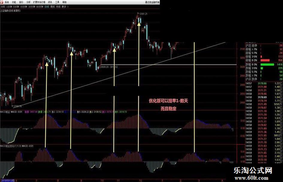 macd修正还算可以的一个指标,今天给出个人的优化版本,喜欢的就下载吧,还是比较稳定的,信号更加及时,转向可以提前1-数天,应该说是不错的工具的。