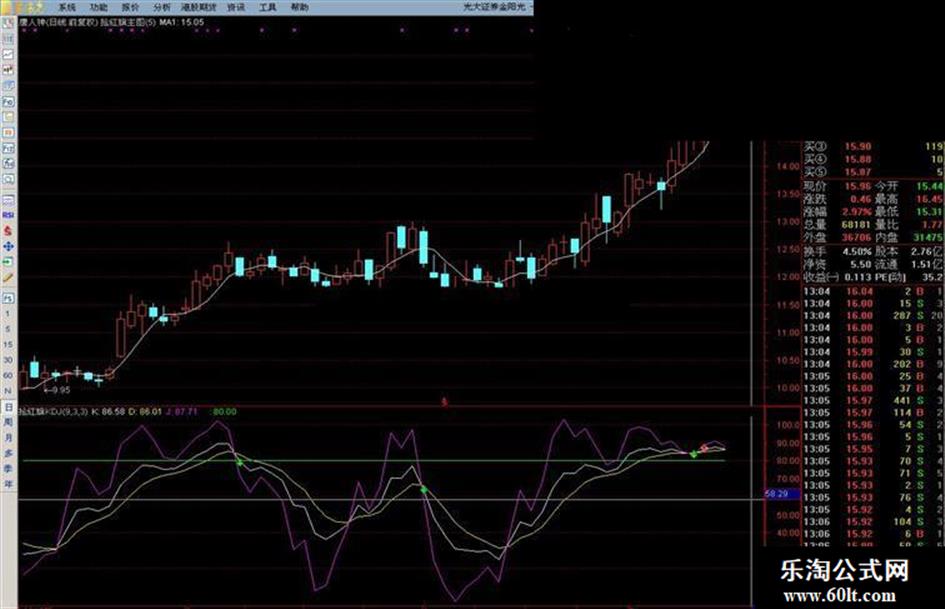 一般KDJ的D值处于80位置左右产生的金叉绝对属于超买状态了,但是很多票在80区间向上仍有一波凌厉的上功趋势,这也是庄家拉高出货的一贯手法。很多小散看着眼馋但又不敢冒然介入,怕被套劳,从而选择传统20区间金叉买入,但又一买就套的众多(毕竟震仓周期太难以把握)。所以,本着资金利用率及收益率最大化的原则,激进地进行高位操是本指标的编写出发点,当然,获利出局以最低1个点为起点(下行2个点出局),蚂蚁搬家创富也是个好办法,毕竟时间短嘛,今买明卖。