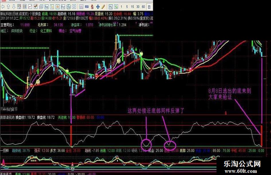 出现红色柱表示阶段底部来到,第二天就可以轻仓打底仓,最好10%仓位,当然结合其他指标可以加大仓位,出现笑脸时可以超过半仓。因为此种底部的出现反弹的概率非常高,不贪心赚个4%出局!当然也可以逐步止盈,进入上升通道再加仓!