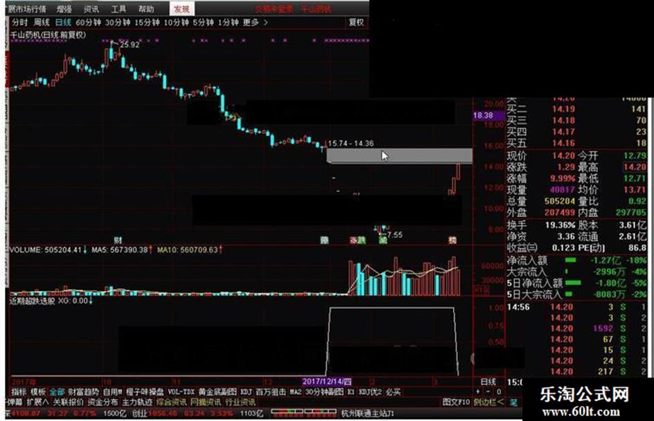 分享一个近其超跌选股指标:从近期高点跌去百分之三十到六十,百分比可调的。供新手参考!