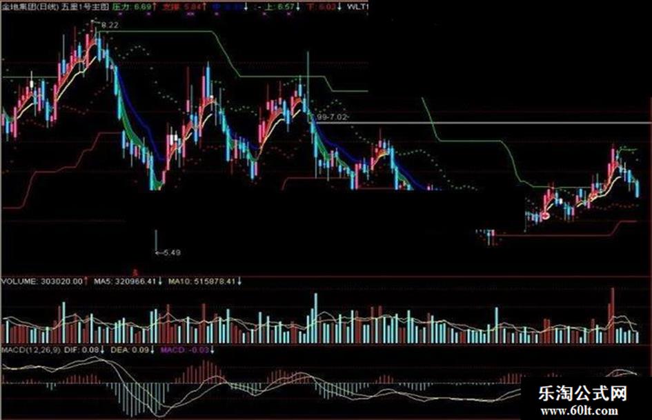 TJ82:=中>=REF(中,1) AND LAST( 中<=REF(中,1),5,1) AND CROSS(C,中) AND C<支撑*1.13;