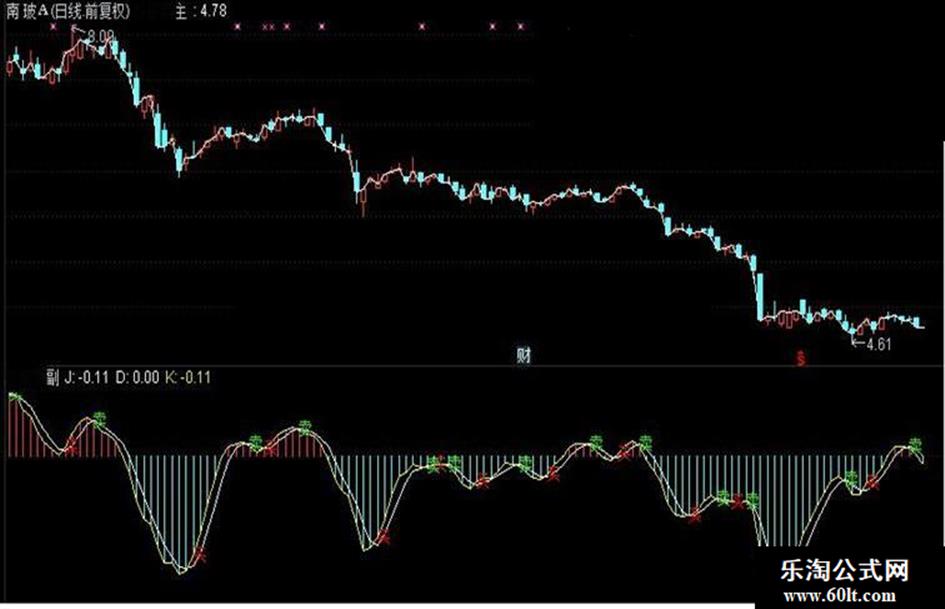 VAR1:=(2*CLOSE+HIGH+LOW)/4; VAR2:=EXPMA(EXPMA(EXPMA(VAR1,4),4),4); J:(VAR2-REF(VAR2,1))/REF(VAR2,1)*100, COLORSTICK; D:MA(J,3); K:MA(J,1); DRAWTEXT(CROSS(K,D),K,'买'),COLORRED; DRAWTEXT(CROSS(D,K),D,'卖'),COLORGREEN;