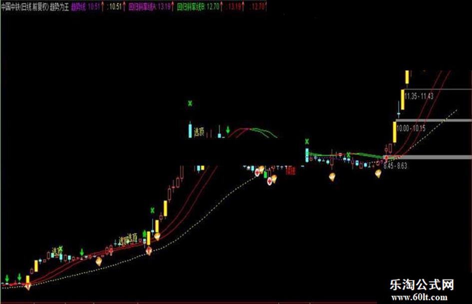 回归斜率买:IF(CROSS(EMA(C,3),回归斜率线A),(L-(H-L)/3),DRAWNULL),POINTDOT,COLOR0000FF;{高亮红}