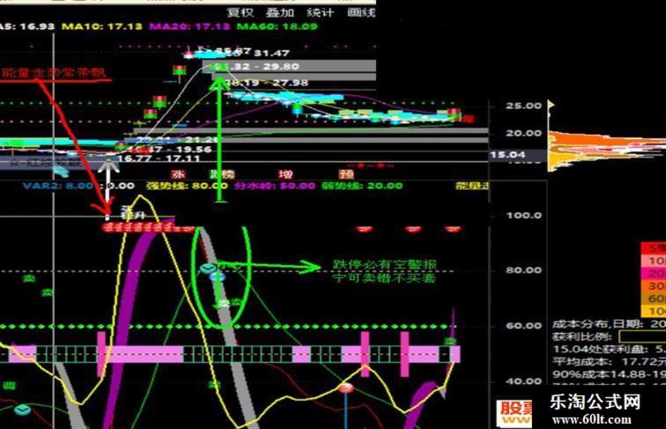 4.紫色带和灰色带在60线下上蹿下跳,股价横盘,不参与,非要等到黄色能量走势线和紫色飘带同时扶摇而上60日线,且“多”图标出现,方考虑介入。