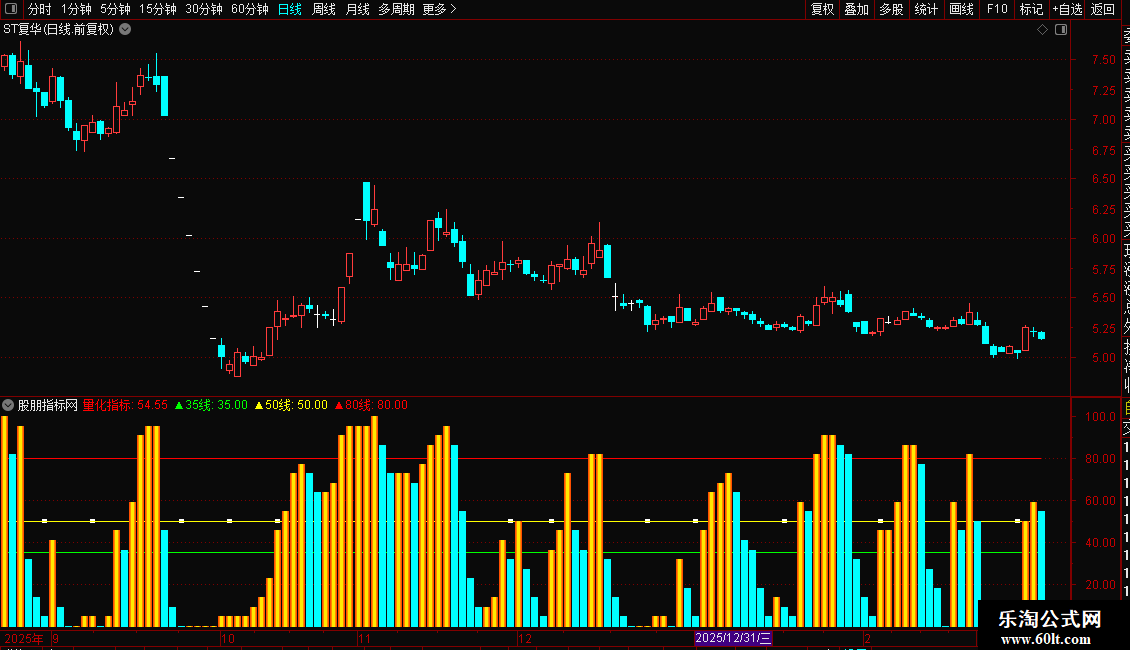 STICKLINE(量化指标>=REF(量化指标,1),0,量化指标,0.6,0),COLOR00C0FF;