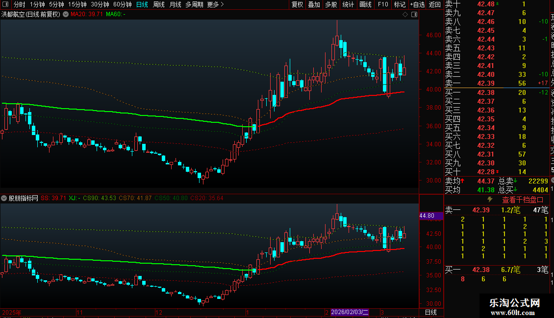 此主图由一根趋势线加四条定位线组成,红色粗线是上升趋势,绿色是下降趋势,可以看到比较强的支撑与压力,虚线是筹码成本线,可以看出筹码走向。如果需要看比较久的K线,需要设置不复权才会准确。