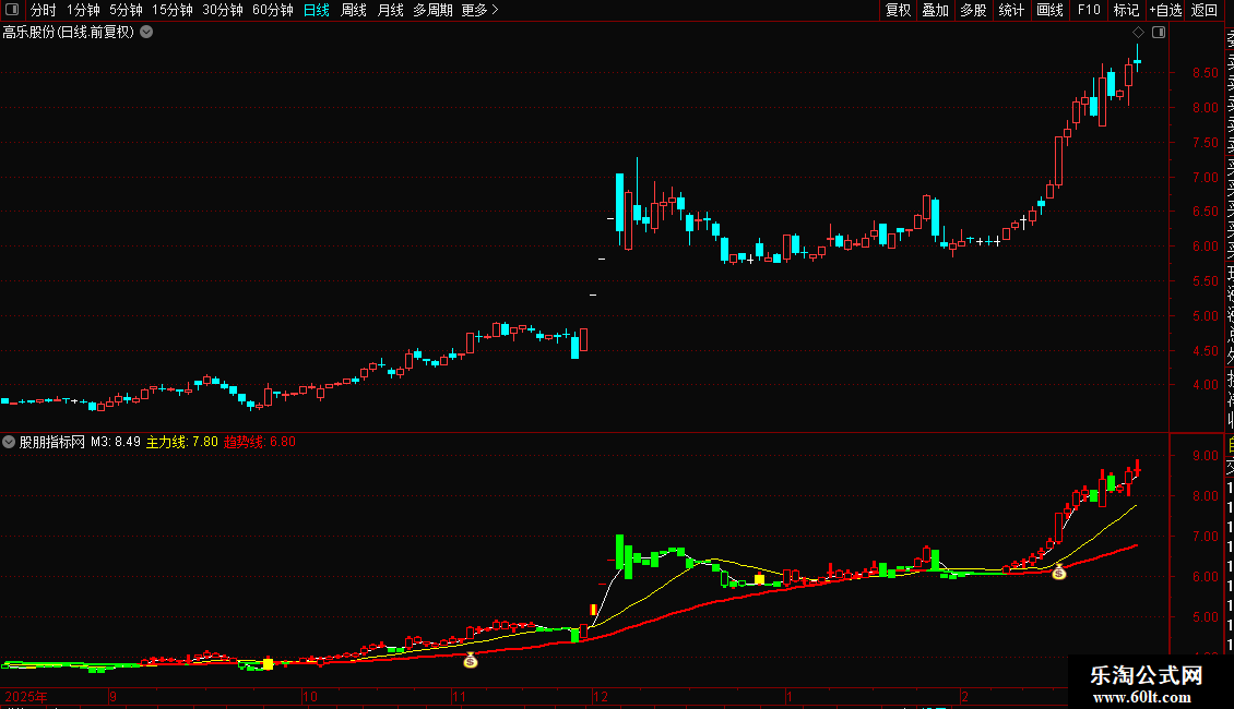 金叉共振:=IF(CROSS(周DIF,周DEA)*BA,MACD+0.1,0)*X3,COLORWHITE,LINETHICK2;
