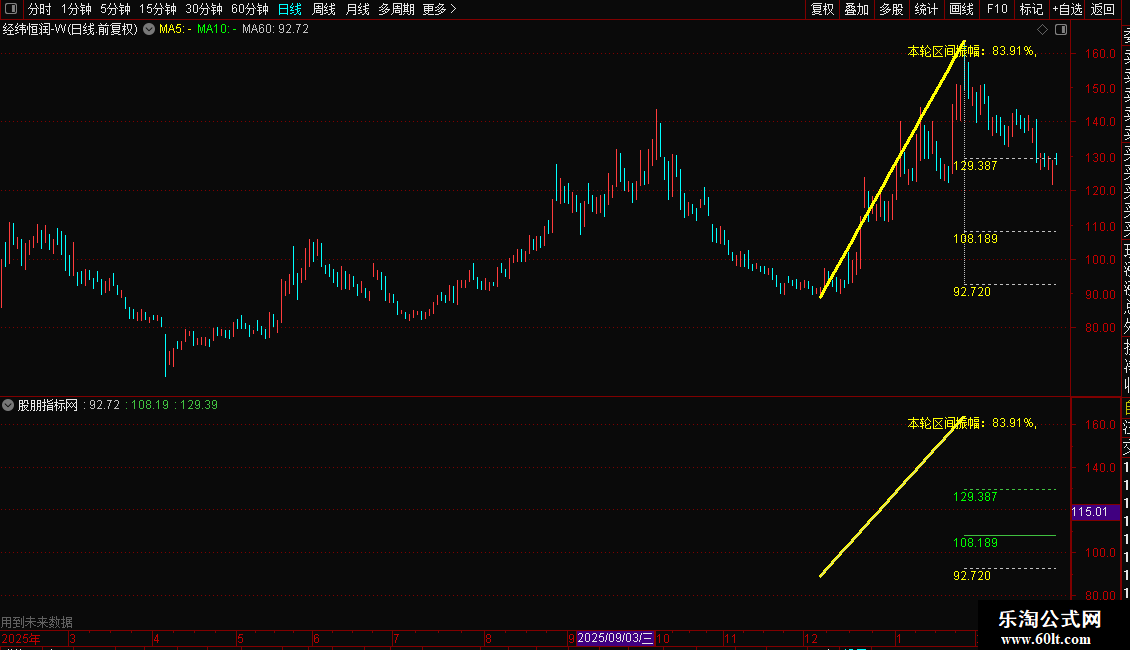 DRAWTEXT(A,G*0.98,VARCAT(VARCAT('本轮区间振幅:',VAR2STR((G-D)/D*100,2)),'%,')),COLORYELLOW;