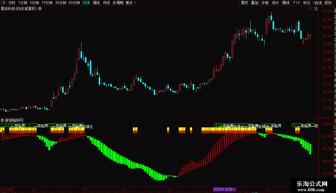 DRAWTEXT(EMA(V11,3)>60 AND EMA(V11,3)>REF(EMA(V11,3),1) AND REF(EMA(V11,3)>60 AND EMA(V11,3)>REF(EMA(V11,3),1),1)=0 AND REF(EMA(V11,3)>60 AND EMA(V11,3)>REF(EMA(V11,3),1),2)=0,96,' ←卖临界'),COLORFFFFFF;