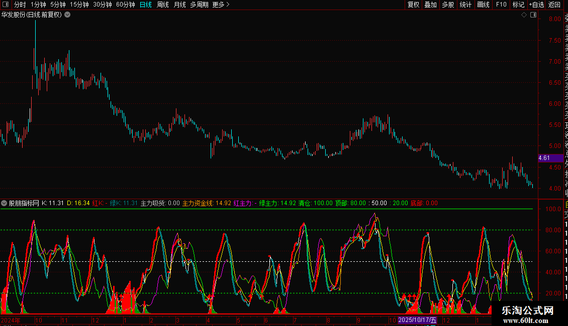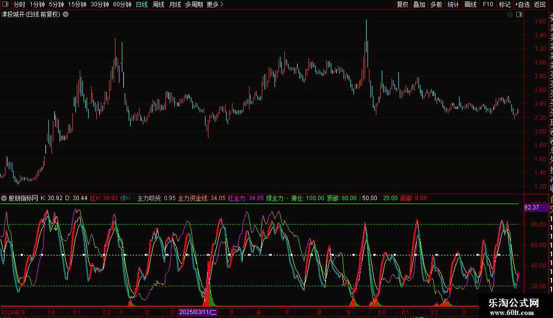 内有主力资金线,20以下低位,80以上拐头快跑。