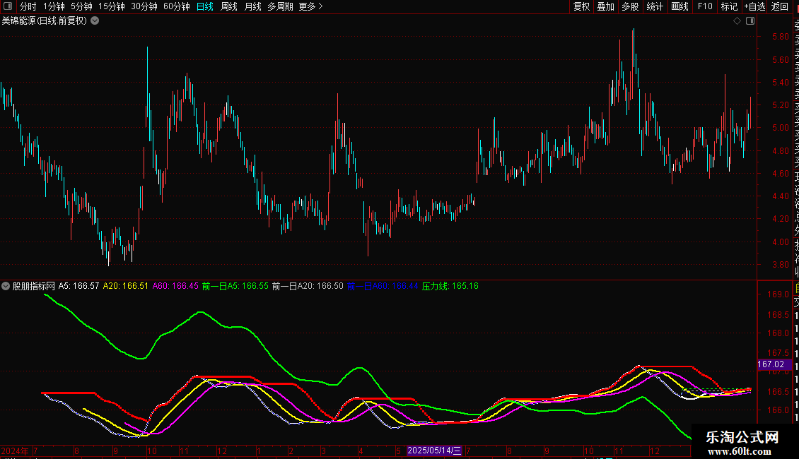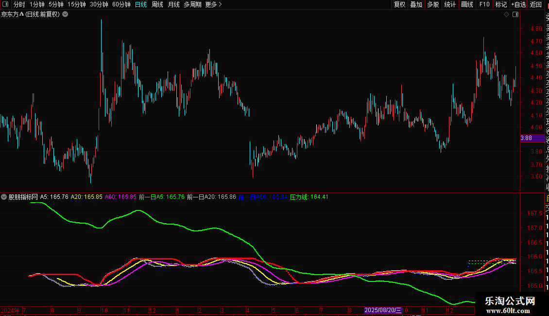 5,注意指标中前一日A5、前一日A20、前一日A60三条虚线随着股价的变化而变动,有时类似于缠论中的中枢却又有不同,当前一日A5、前一日A20、前一日A60多头排列时,股价趋势良好,当前一日A5逐渐下行,渐渐低于前一日A20、前一日A60时,注意变盘的风险。。。