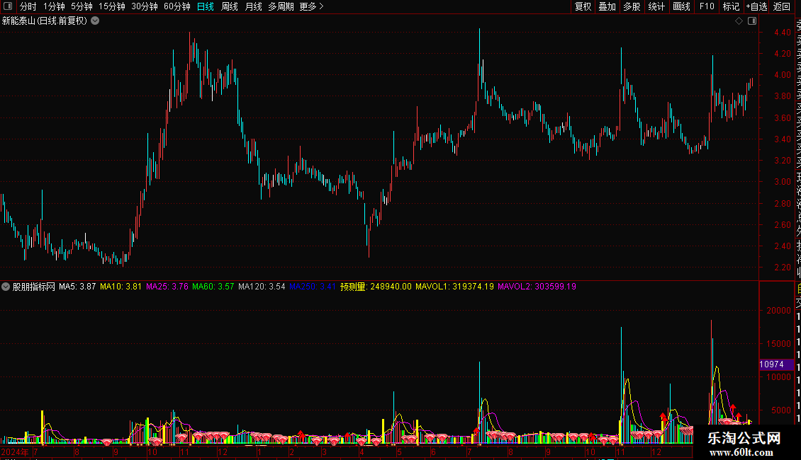 预测量:IF(CURRBARSCOUNT=1 AND PERIOD=5,VOL*240/FROMOPEN,VOL),VOLSTICK;