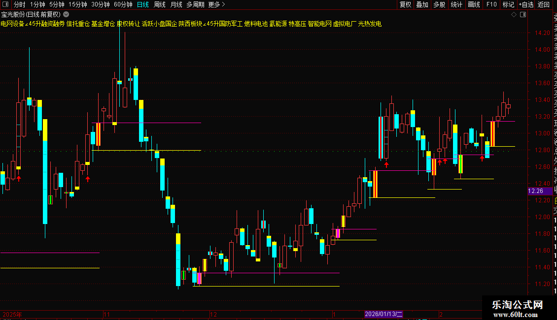 下三一:(MAX(OPEN,CLOSE)-MIN(OPEN,CLOSE))/3+MIN(OPEN,CLOSE),NODRAW,COLORYELLOW;