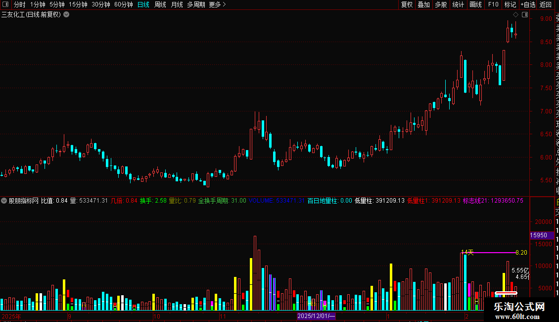 量比:VOL/REF(MA(VOL,5),1),NODRAW,COLORBROWN;