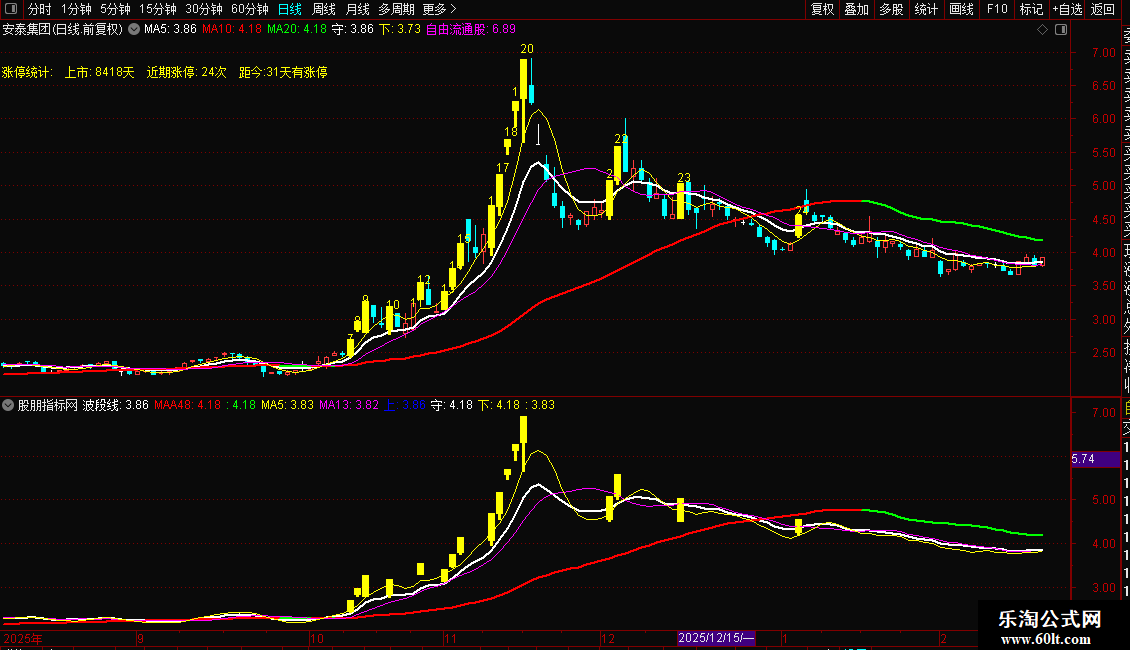 波段线:(MA(CLOSE,3)+MA(CLOSE,6)+MA(CLOSE,12)+MA(CLOSE,24))/4,COLORWHITE,LINETHICK2;
