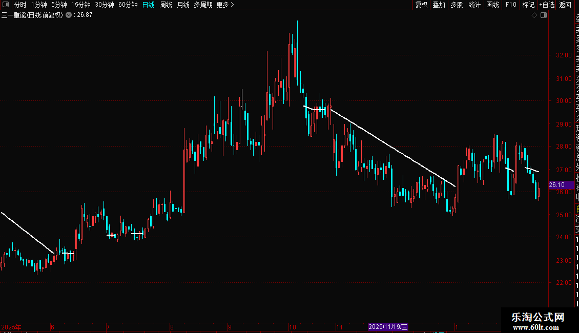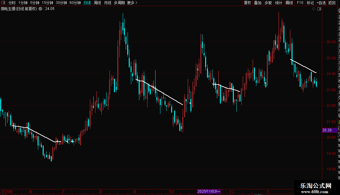 DRAWLINE(C>=趋势线,趋势线,C<趋势线,趋势线,0),COLORWHITE,LINETHICK2;