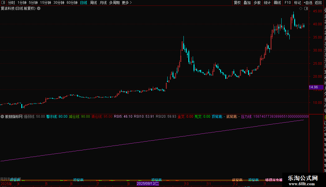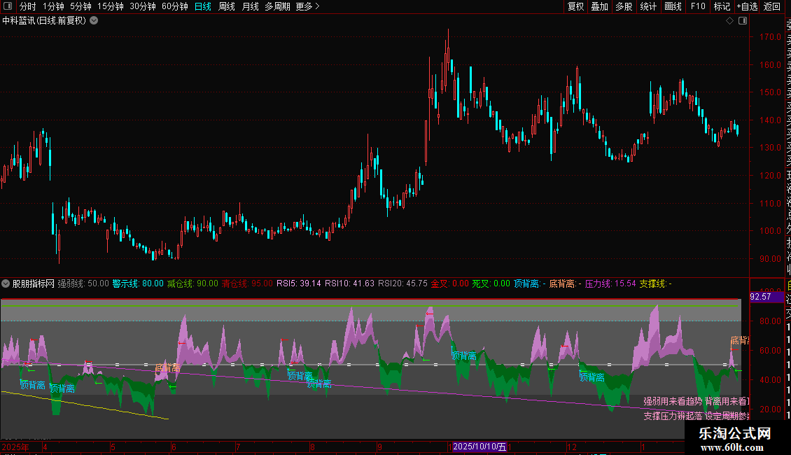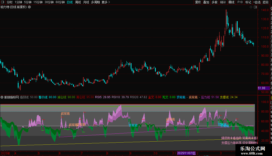 DRAWTEXT(CURRBARSCOUNT=30,25,'强弱用来看趋势 背离用来看顶底'),COLORCC99FF;