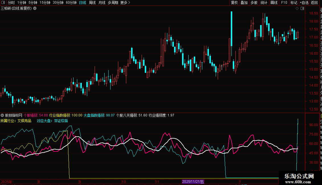 在一个副图中同时显示大盘(青色)、行业(黄色)、个股(洋红)、以及个股均线(白色)四条线。便于日常观察个股走势的强弱。