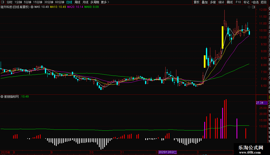 STICKLINE(C>=REF(C,1)*1.098 AND C=H,C,O,3,0),COLORYELLOW;