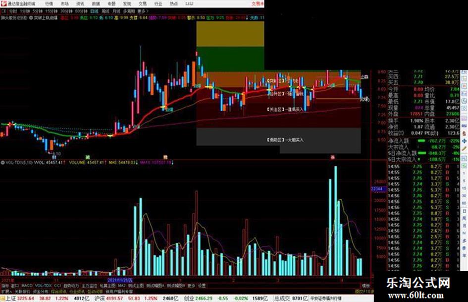 DRAWTEXT(CURRBARSCOUNT=N/4+5,DD+KJ/3,'【关注区】--逢低买入'),COLORFFFFFF;