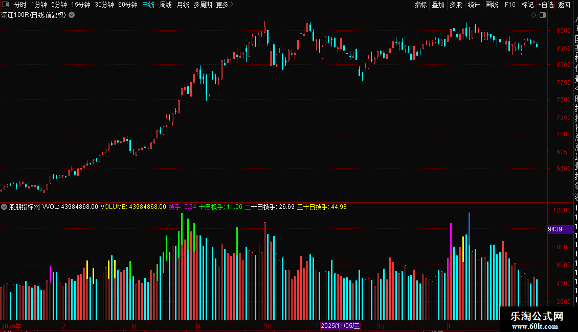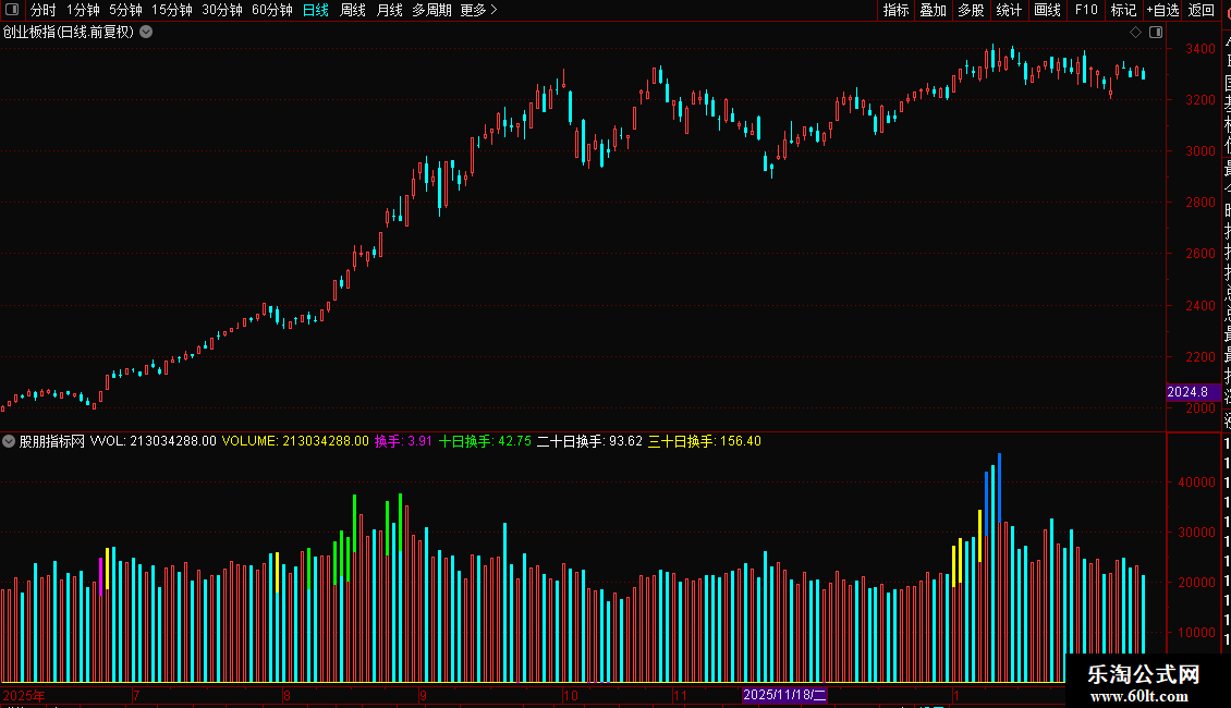 量柱下方,粉红色是三十日地量,黄色是六十日地量,绿色是一百天地量,蓝色是一年地量}