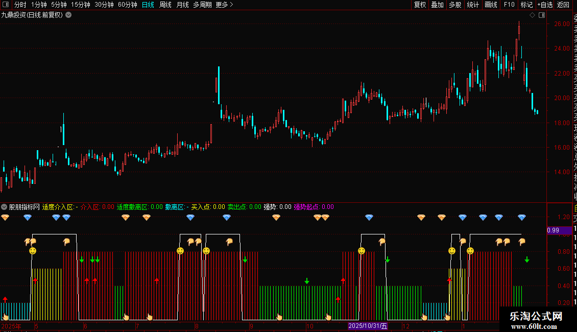 4.买入信号:在个股强弱下行阶段,如涨势、涨幅先后上拐,会出现上指买入信号。如涨幅上穿个股强弱或0轴,会分别出现低位或高位红箭买入信号。