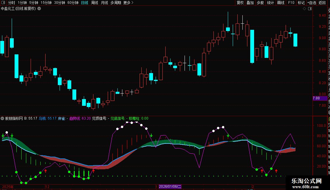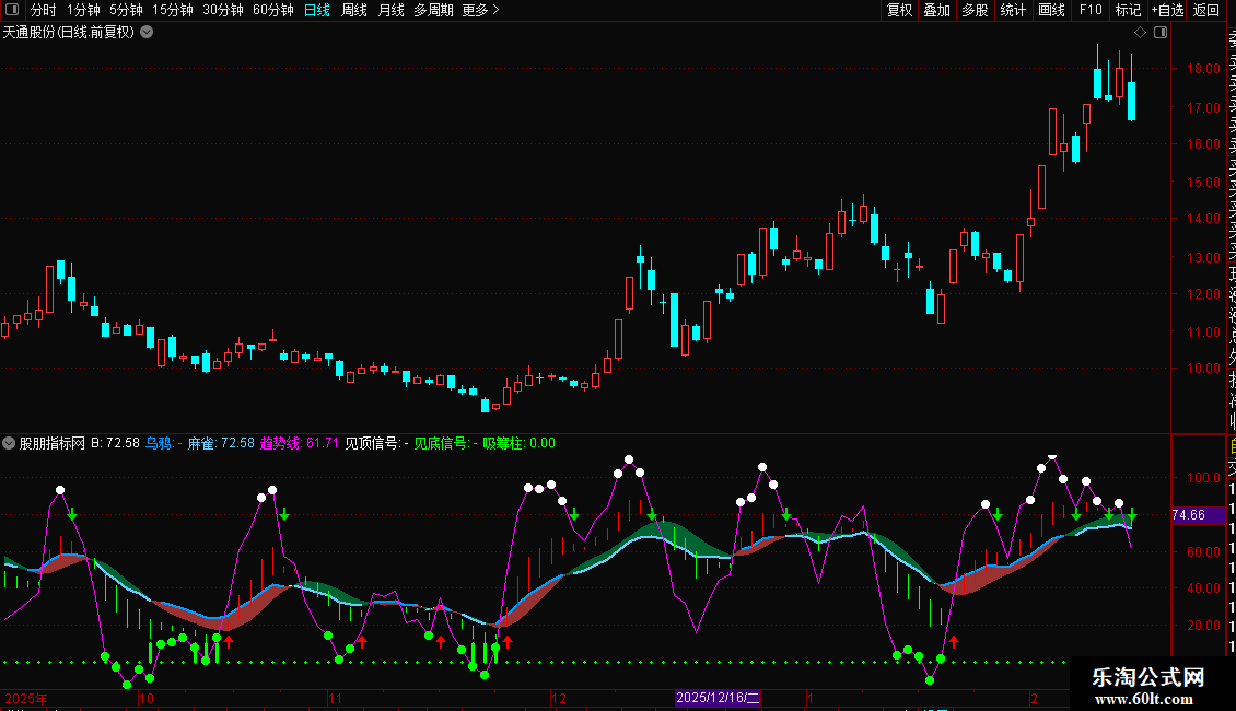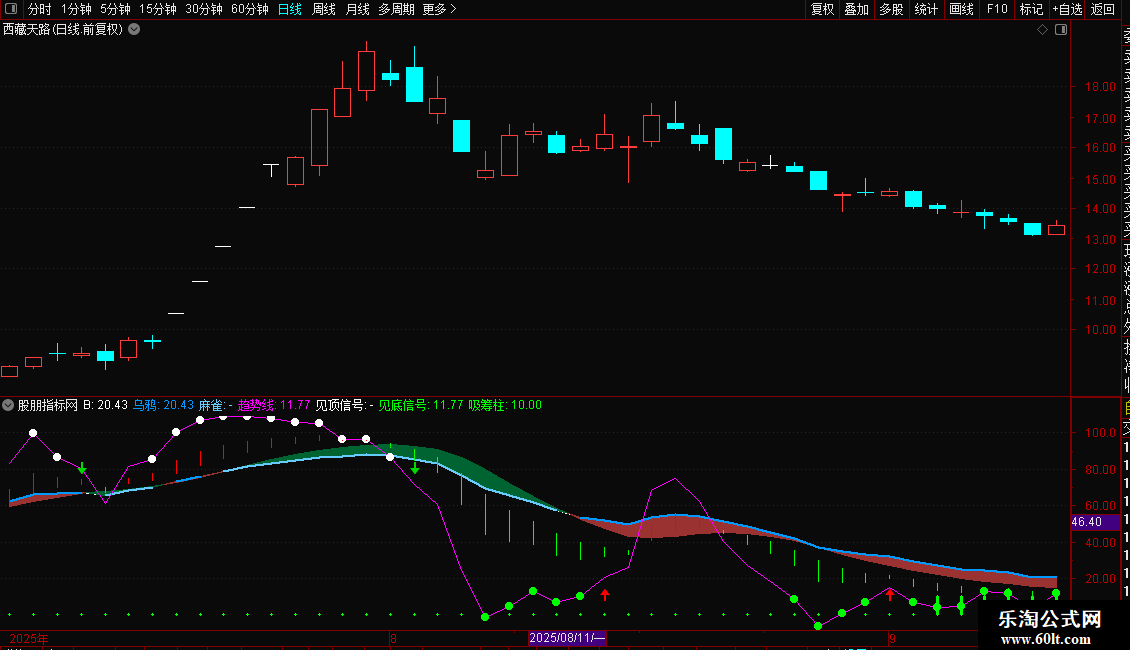 见底信号:IF(趋势线<=15,趋势线,DRAWNULL),CIRCLEDOT,COLOR00FF00,LINETHICK3;