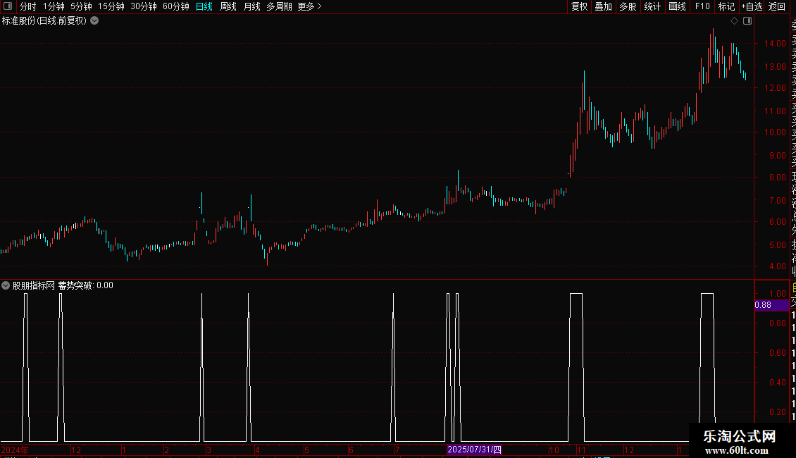 蓄势突破 : ((((((((((((((((((DATE < 1991201) AND ((ZT60 >= 1) OR (COUNT(冲ZT,30) >= 1))) AND ((HHV(C,3) >= HHV(C,60)) OR (HHV(H,3) >= HHV(H,60)))) AND (C > REF(通道3,1))) AND (C > 通道1)) AND (通道1 > REF(通道1,1))) AND (MA30 >= REF(MA30,1))) AND (MA60 >= REF(MA60,1))) AND (MA10 >= REF(MA10,1))) AND (HHV(虚换手,3) >= 5)) AND 我大盘) AND (DYNAINFO(4) > 0)) AND (((ADX > REF(ADX,1)) AND (ADXR > REF(ADXR,1))) OR ((ADX > REF(ADX,1)) AND (PDI > REF(PDI,1))))) AND (MDI < REF(MDI,1))) AND (PDI > 20)) AND (ADX > 30)) AND (ADXR > 30)) AND (MDI < 20)) AND (CCI >= 100);