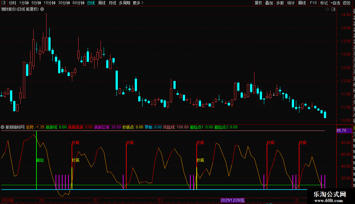 DRAWTEXT(CROSS(100,走势) AND C<生命线,50,'避险'),COLORGREEN;