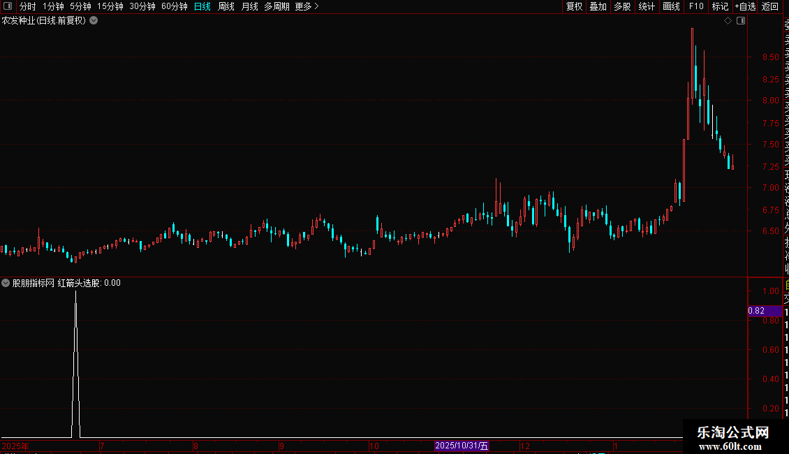 3. 红箭头选股:当“动力线”自下向上突破0.5(重点关注线)时,在K线图上标记买入信号箭头。