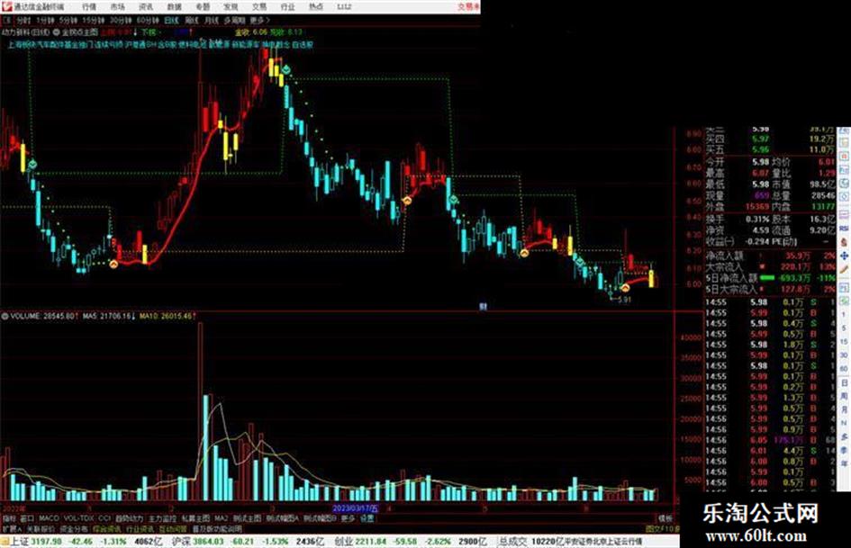 黄铢消失见顶:=IF(柱变向价>=DIF拐头价,柱变向价,DRAWNULL),COLORYELLOW,CIRCLEDOT,LINETHICK1;